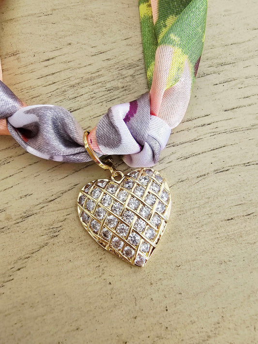 Exclusive Peach Floral Scarf Necklace – 18k Gold Plated Heart Charm