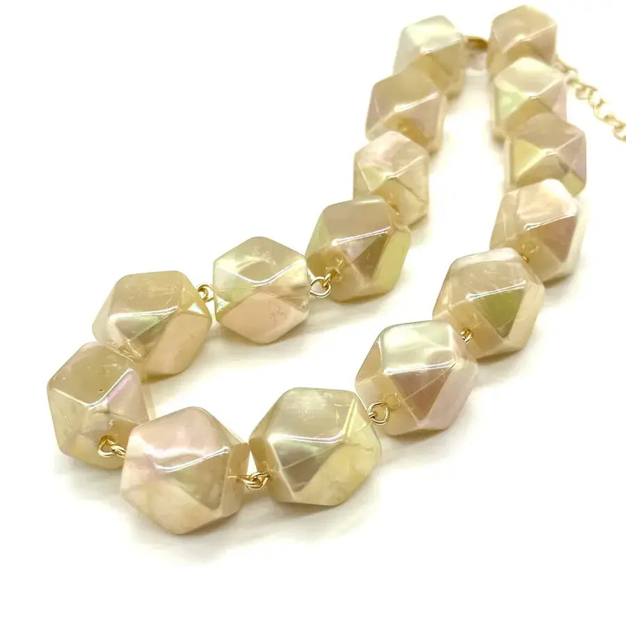 The Box of Borealis Amelia Necklace is pure vintage magic — a strand that glows with opalescent shimmer and faceted dimension. Made with rare vintage lucite beads from the 1960s–70s, each bead is cut into a bold geometric shape and finished with an aurora borealis coating that flashes hints of pearl, champagne, and soft iridescent hues. Adjustable from 16" to 22", this chunky Amelia is lightweight, collectible, and full of luminous drama.