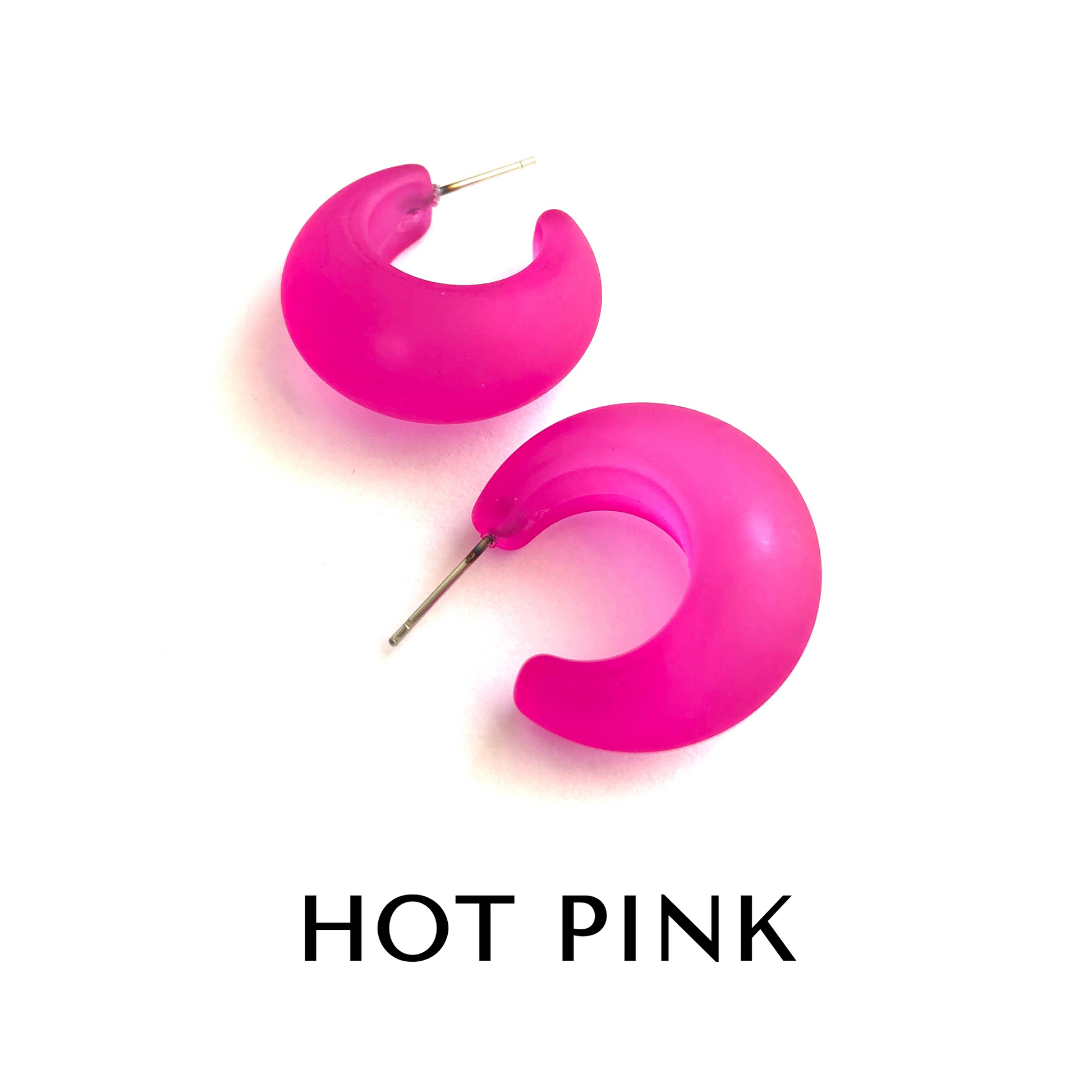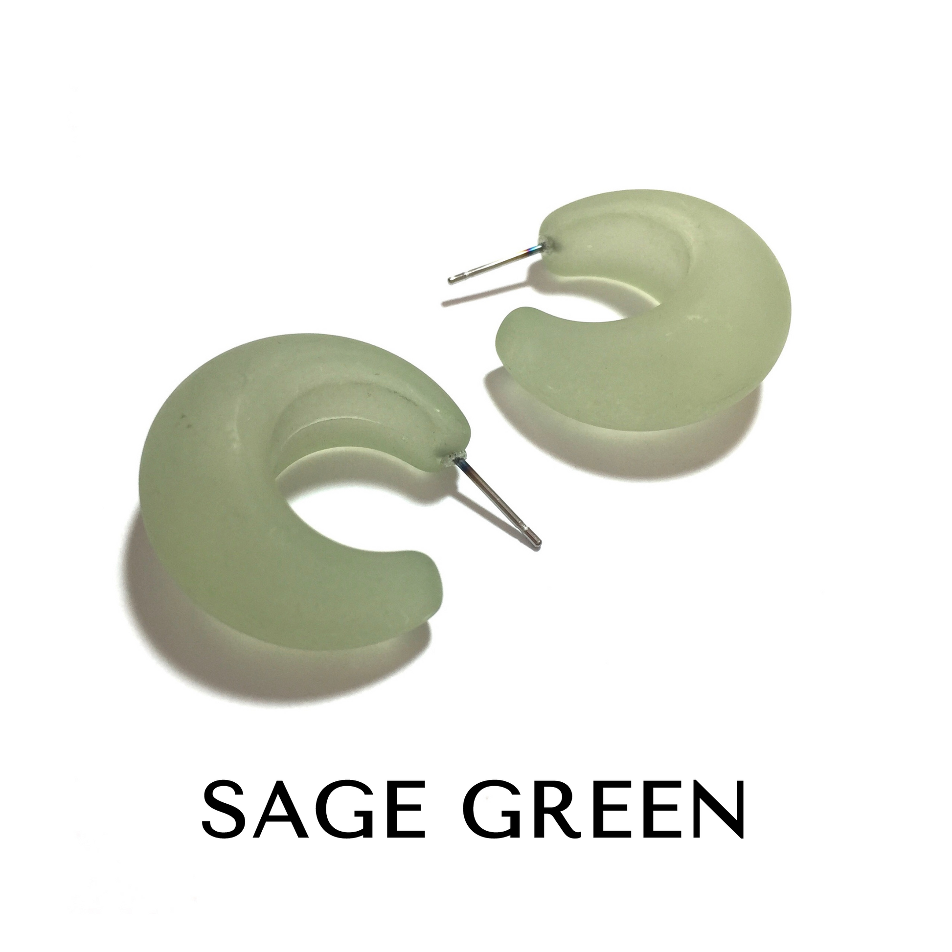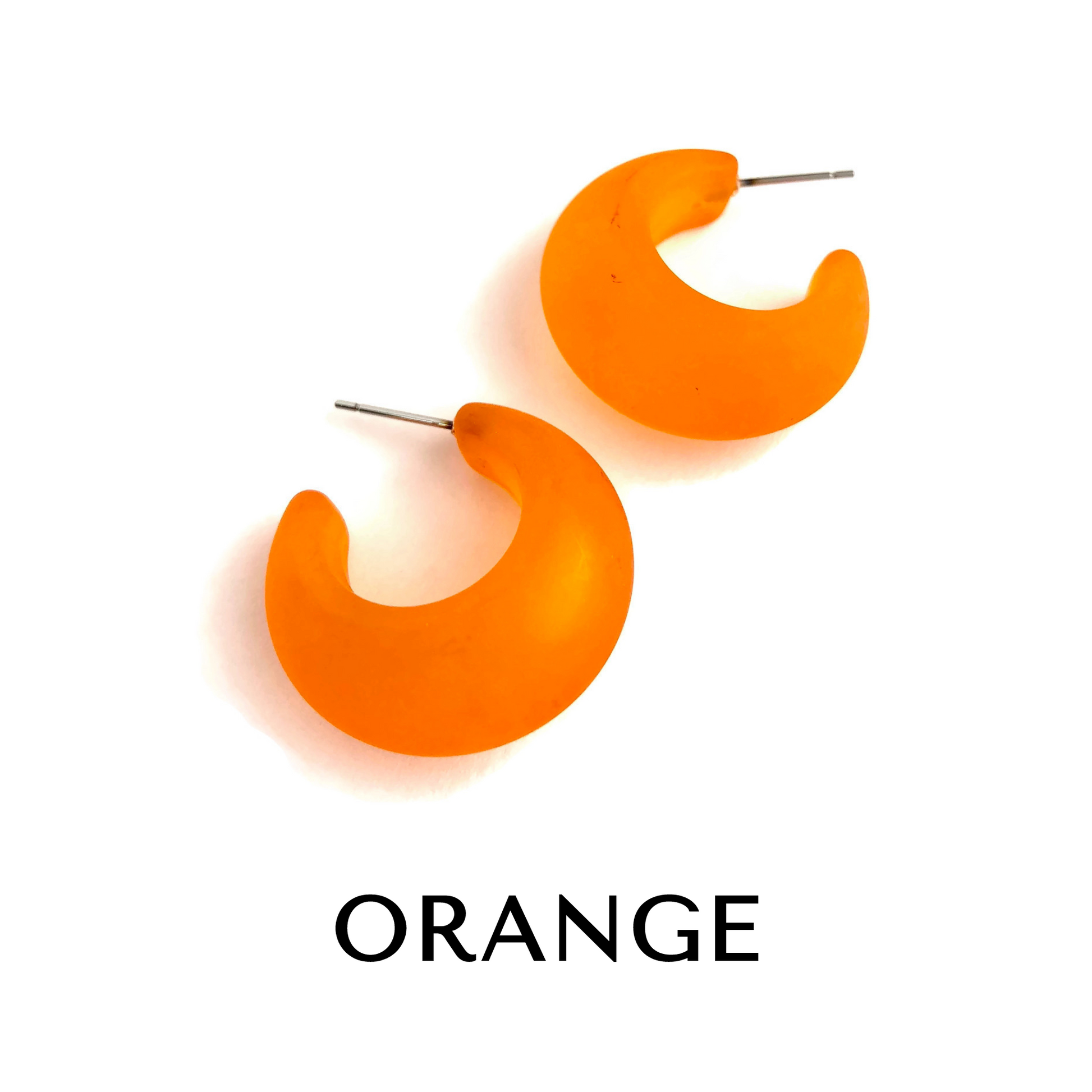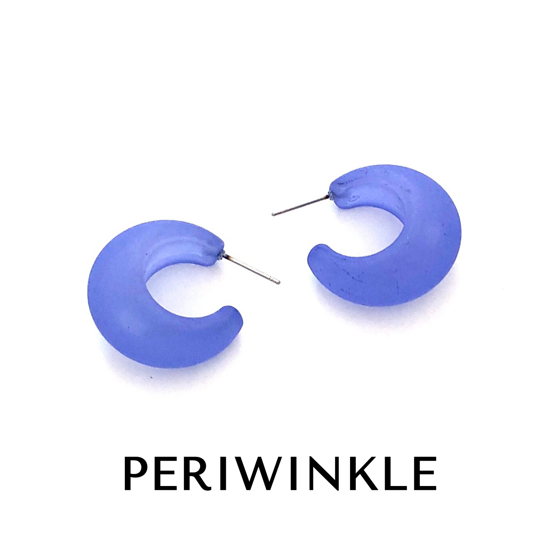 Hoop earrings with a frosted finish. This style hoop is called the Snail Shell Hoop & is made of vintage matte lucite. Each measures just about 1 inch in diameter & 13mm in width at the widest point.