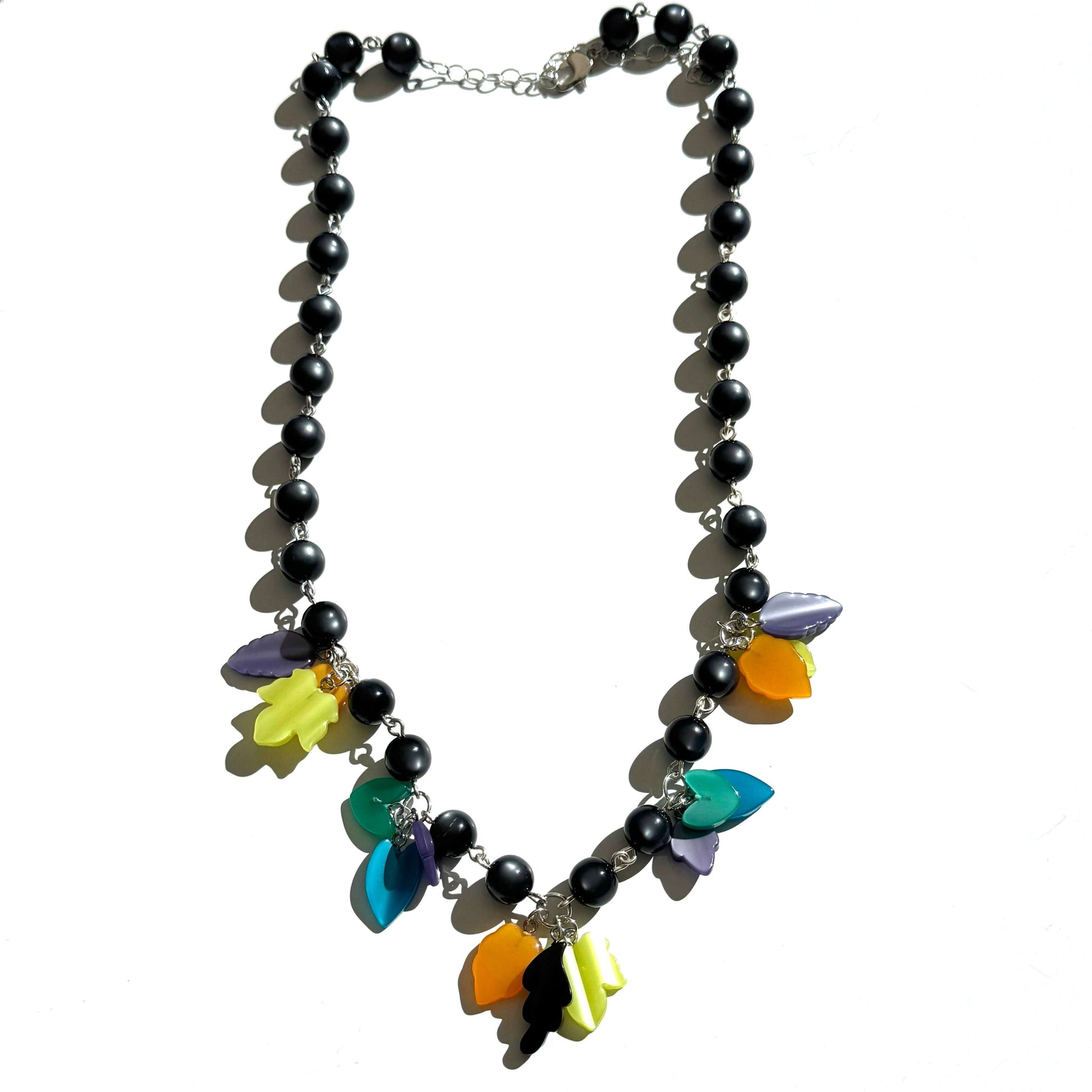 The Enchanted Moonglow Leaves Necklace is a joyful strand of vintage charm and color. Handwired with glossy black 1960’s moonglow beads, this necklace comes alive with dangling leaf charms in a rainbow of moonglow hues — each one made from authentic vintage deadstock lucite.