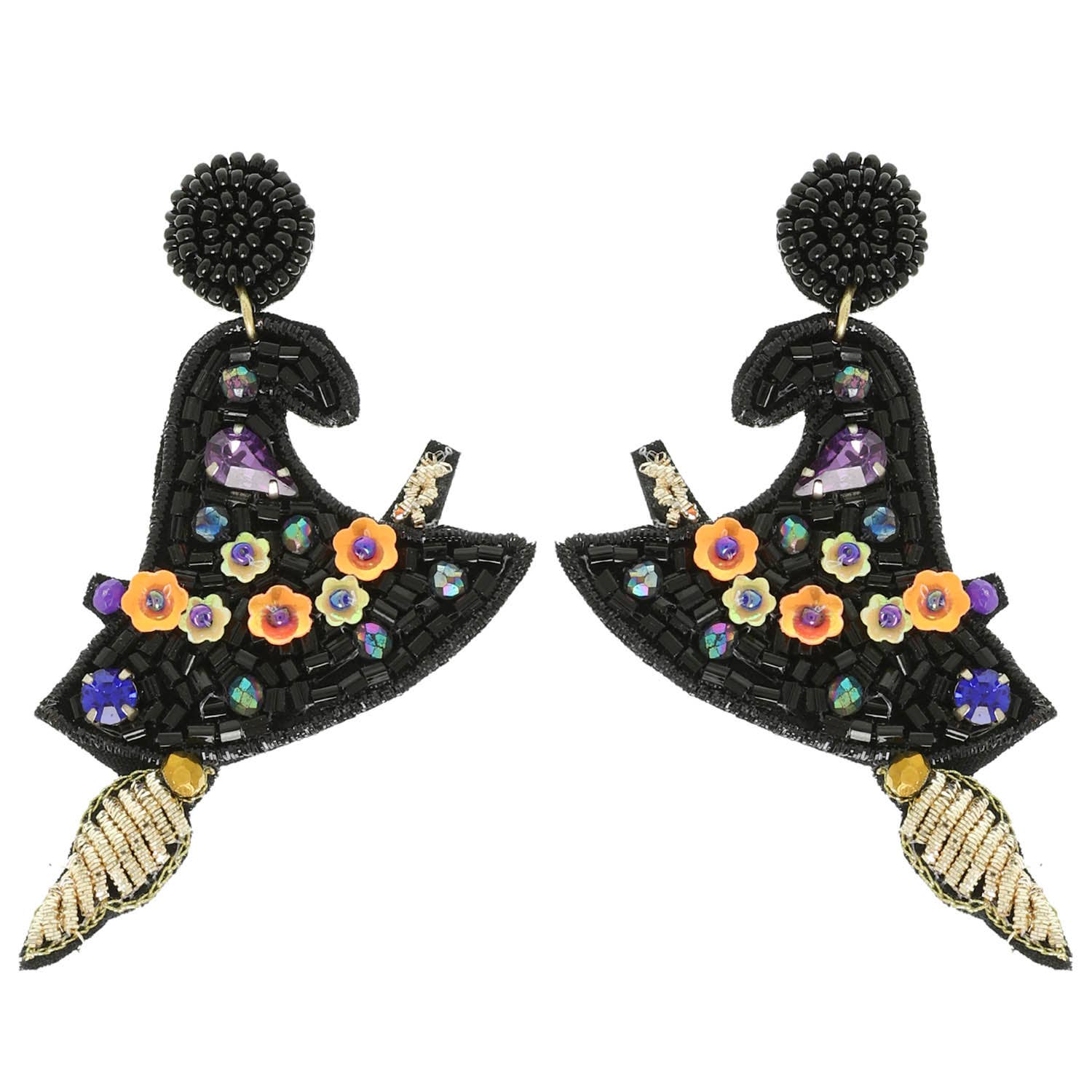 Whimsical and full of spellbinding charm – our Midnight Bloom Earrings feature handcrafted witch hats adorned with vibrant floral accents and shimmering crystal seed beads. Light in weight but rich in detail, they’re the perfect way to give classic Halloween style a fresh, feminine twist.