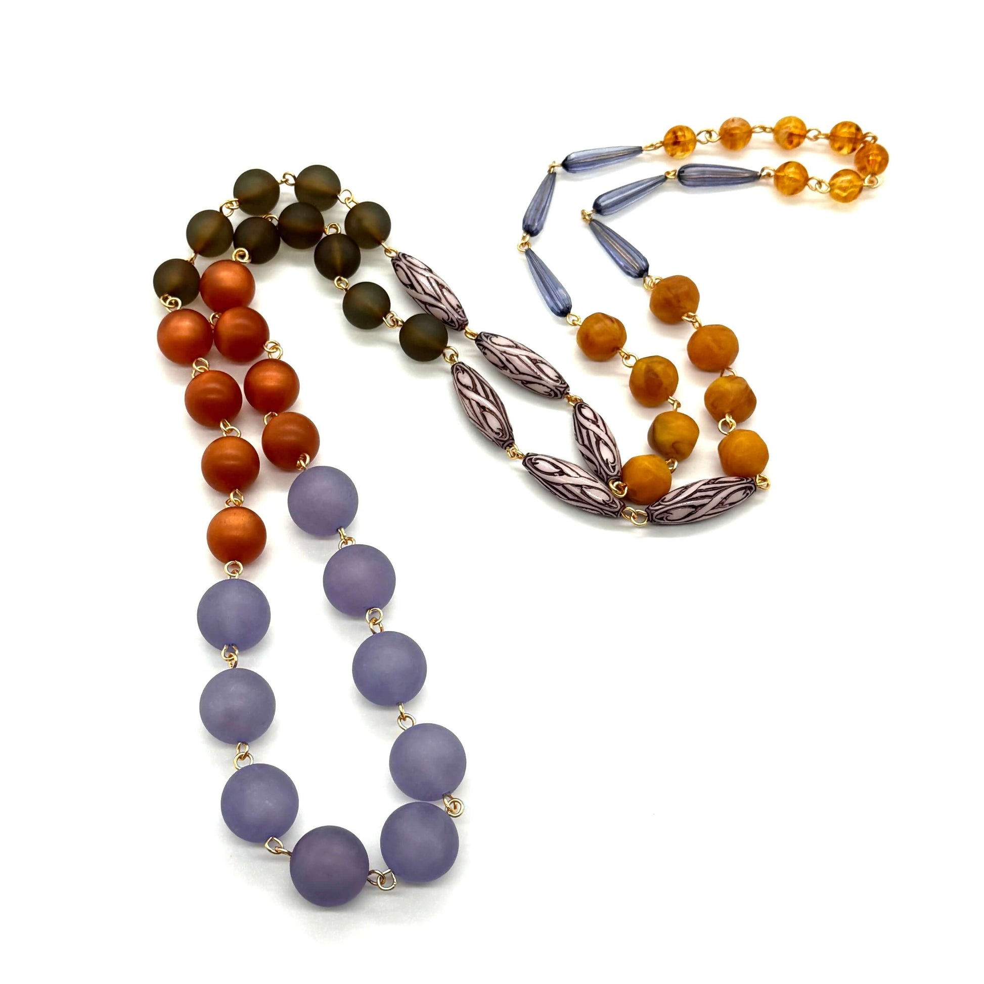 Meet the Periwinkle Copper Rosary-Chained Rope Necklace — a strand that balances soft cools with warm metallics in a perfectly vintage palette. This piece combines frosted periwinkle rounds, rich copper beads, earthy moss, golden amber, and patterned vintage ovals, each hand-linked to create a rope-length strand.