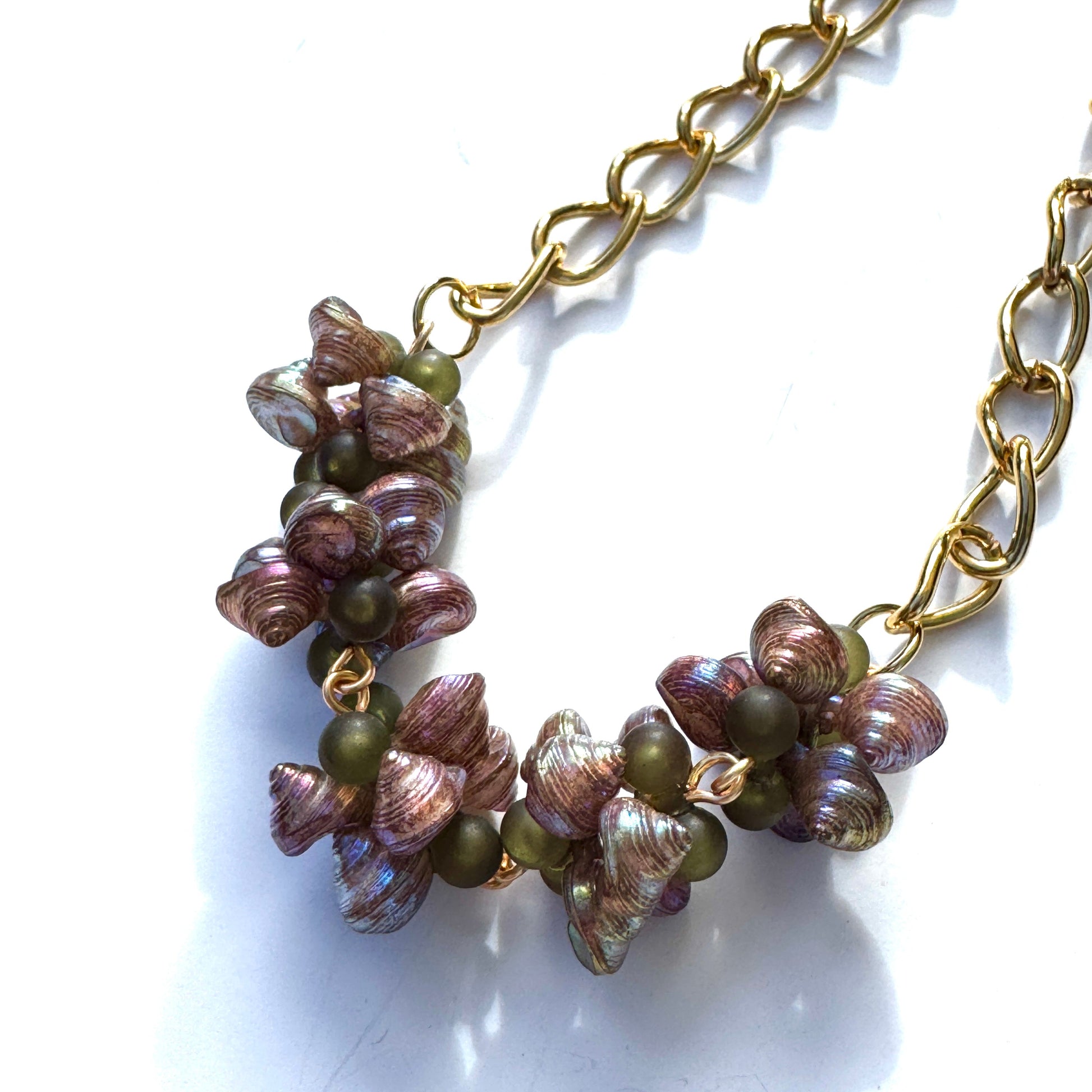 Channel your inner sea goddess with the Sirena Shell Necklace — a luminous beauty made with rare vintage lucite shells from 1970s Europe. Each iridescent cluster catches the light like treasures from the tide, creating a sculptural statement that feels both ocean-inspired and artfully modern.
