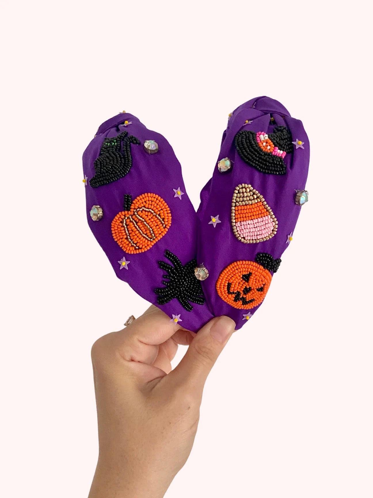 Playful, bold, and brimming with spooky charm – our Spellbound Nights Headband is a purple showstopper covered in beaded Halloween icons, from pumpkins and candy corn to black cats and stars. Finished with a soft velvet lining for all-day comfort, it’s the ultimate way to top off your festive look.