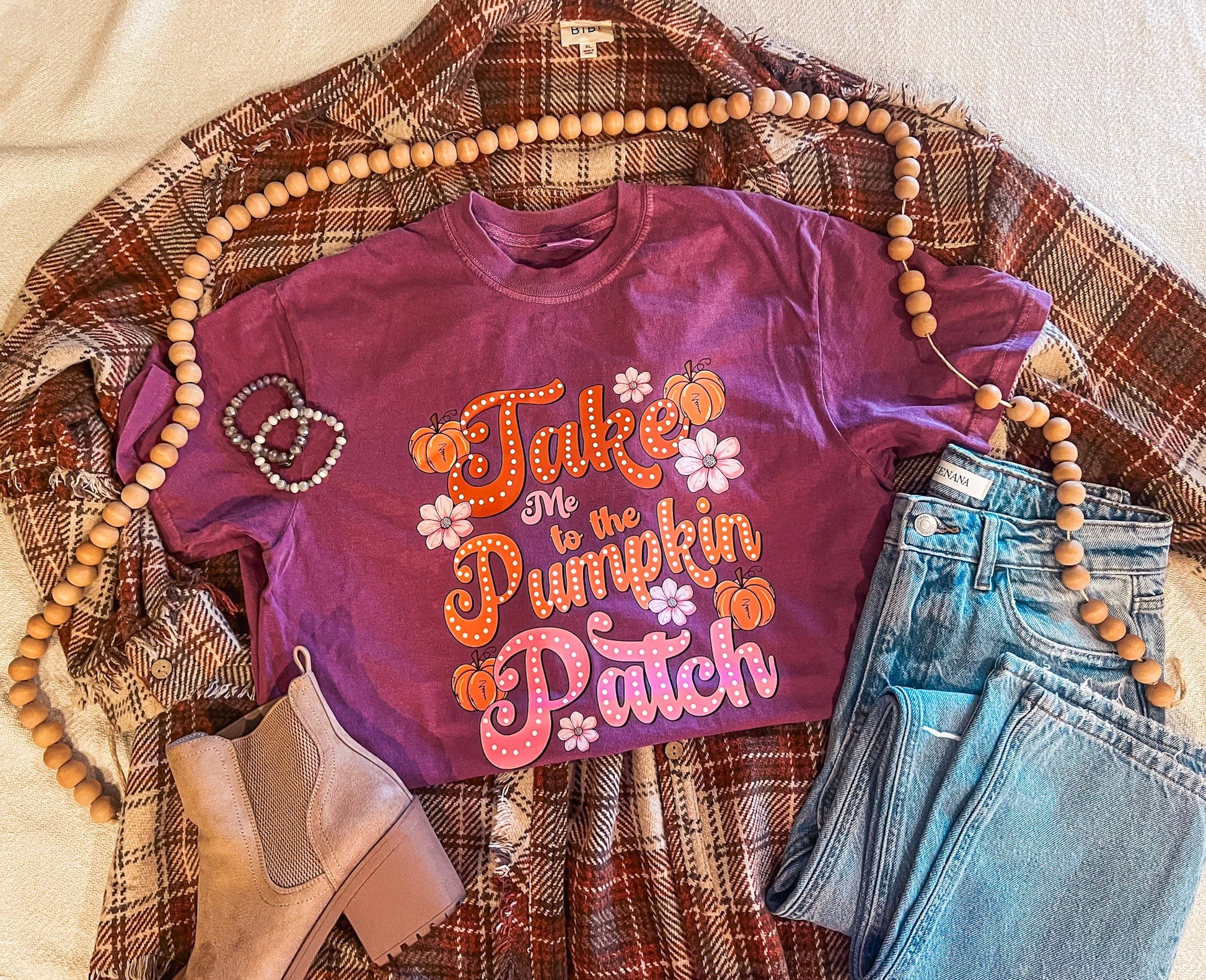🍷 Take your fall style to the next level with the Merlot Take Me to the Pumpkin Patch Graphic Tee! Featuring a rich wine-toned backdrop and playful seasonal lettering, this soft and comfy tee is made for autumn days spent exploring pumpkin patches, sipping cider, and soaking in all the cozy vibes.
