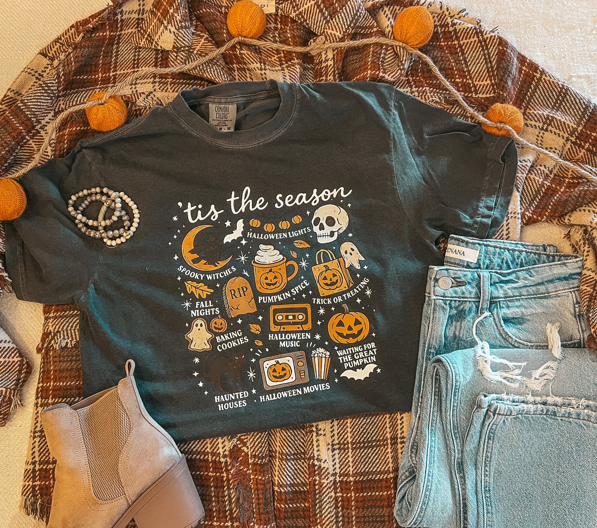👻 ‘Tis the Season for all things spooky! This festive graphic tee celebrates everything you love about Halloween — from pumpkin spice and haunted houses to trick-or-treating, spooky witches, and scary movie nights. Designed on a soft, comfy tee, it’s the perfect pick for cozy fall nights, pumpkin patch trips, or handing out candy in style.